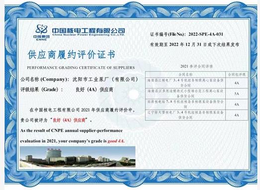 沈陽市工業泵廠(有限公司)獲得中國核電工程有限公司4A供應商履約評價